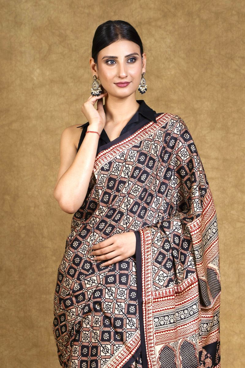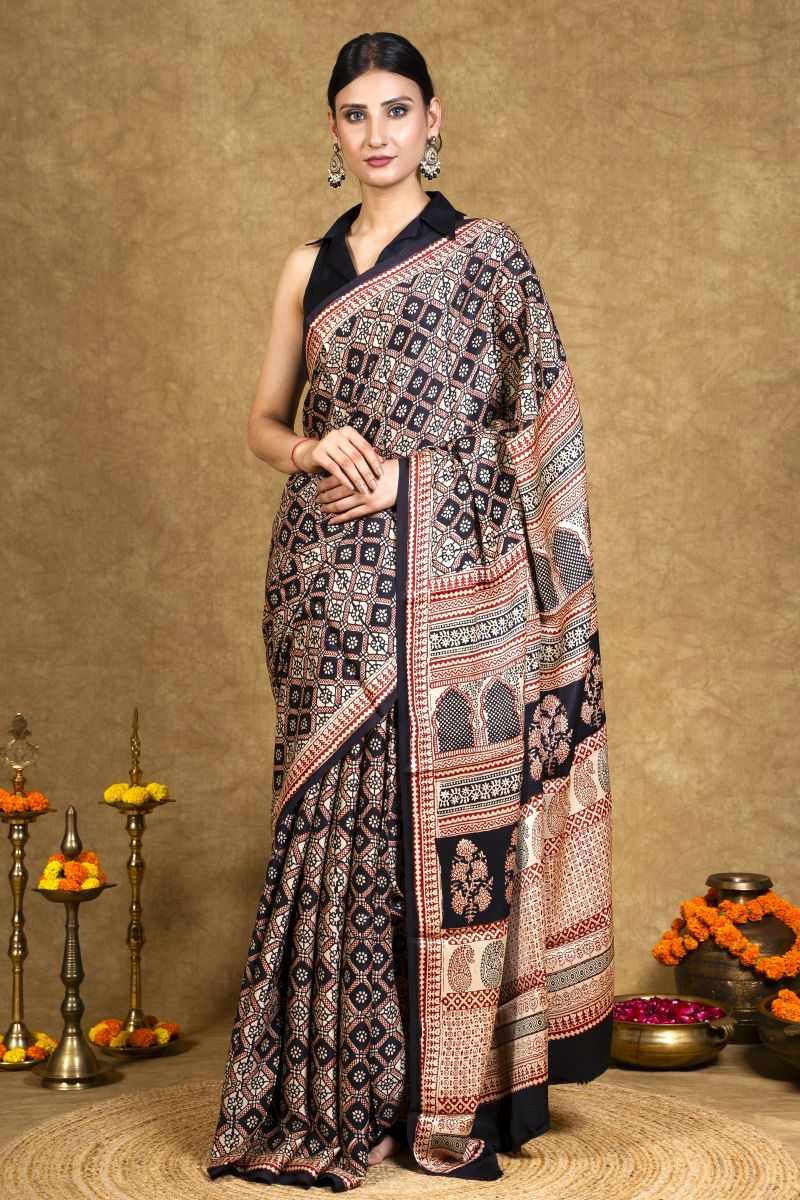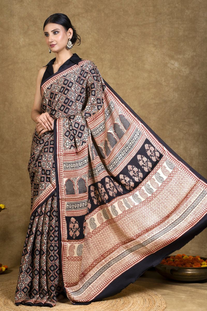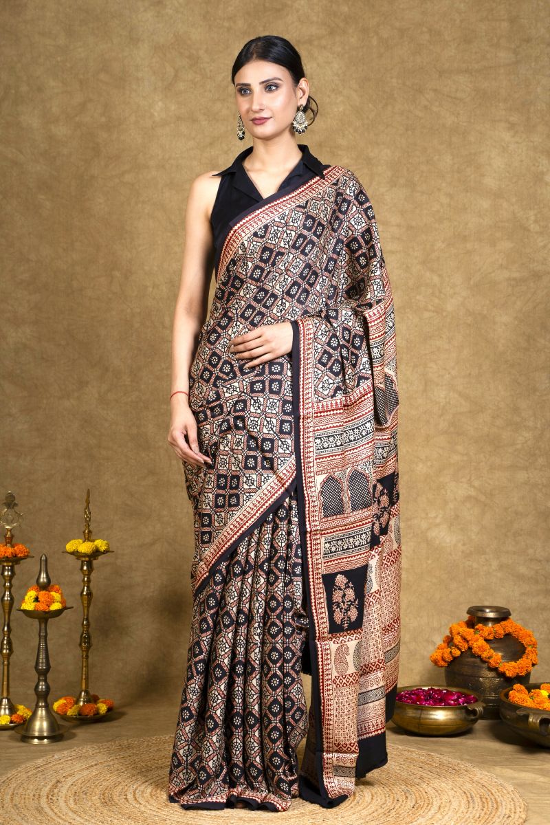 Black & Rust Bagh Hand Block Printed Modal Silk Saree