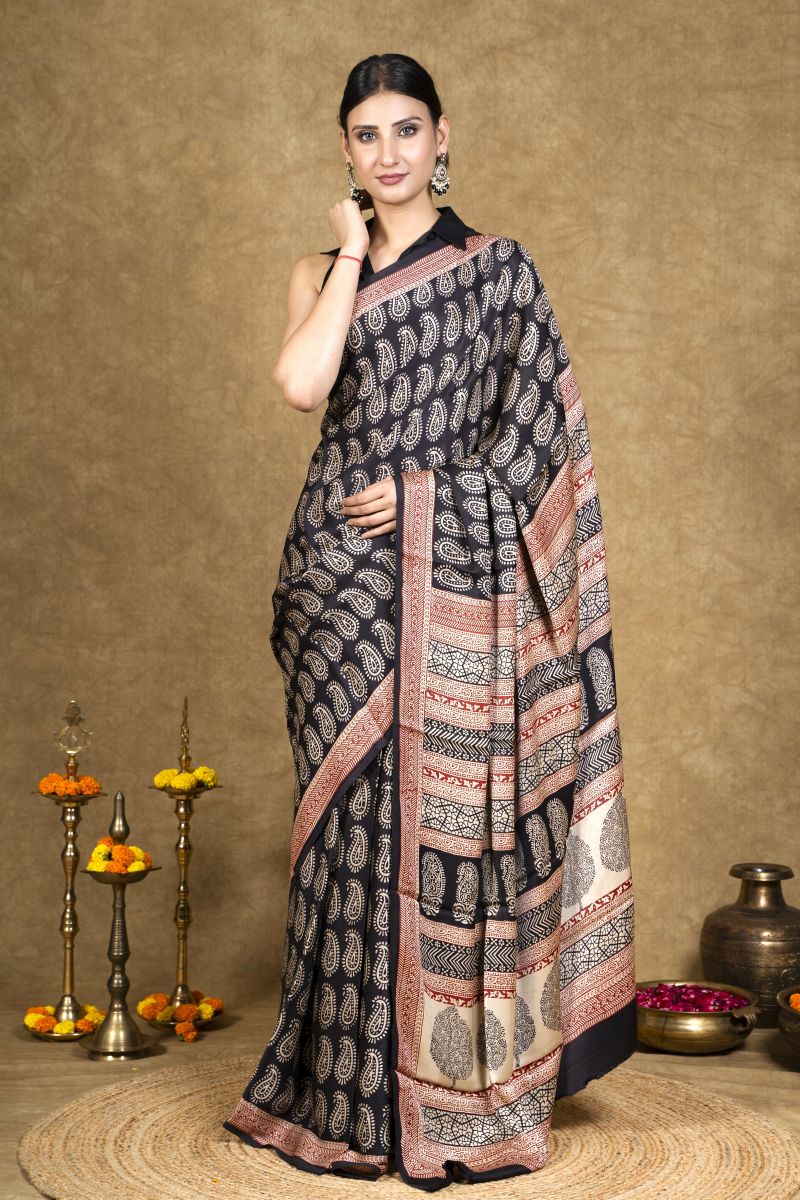 Black Paisley Bagh Hand Block Printed Modal Silk Saree