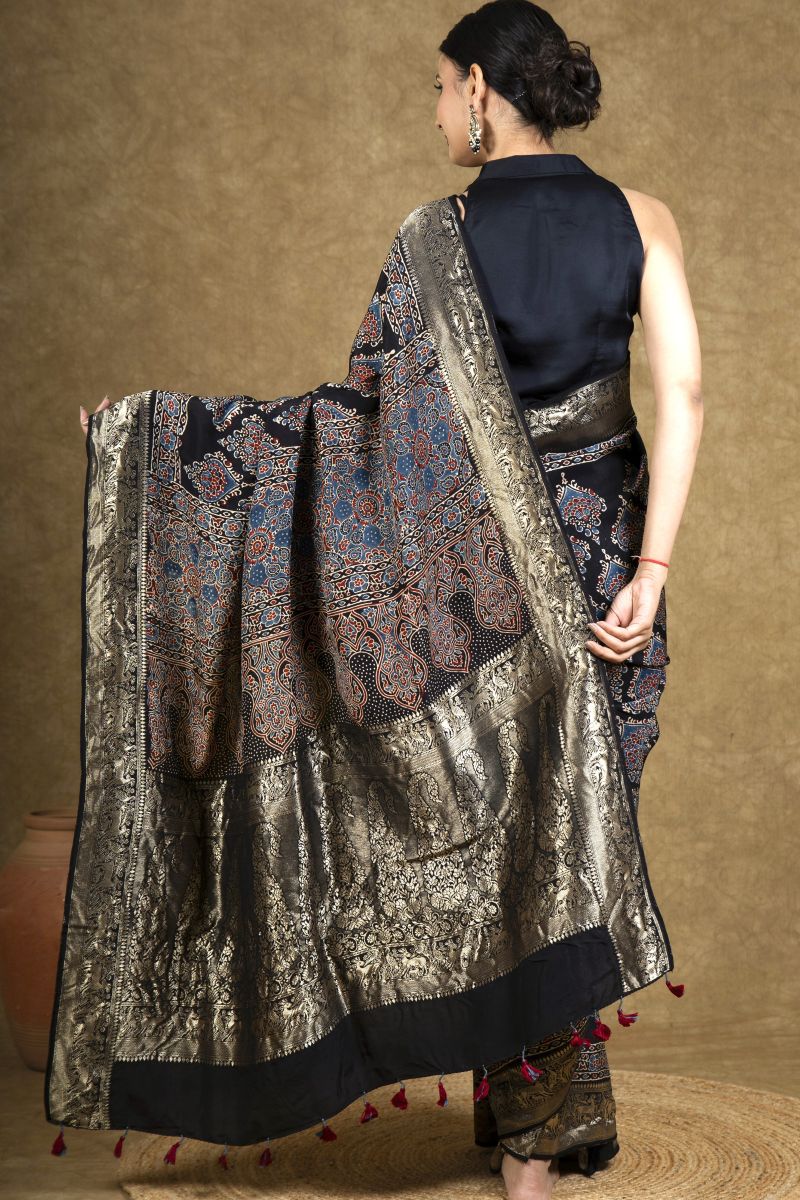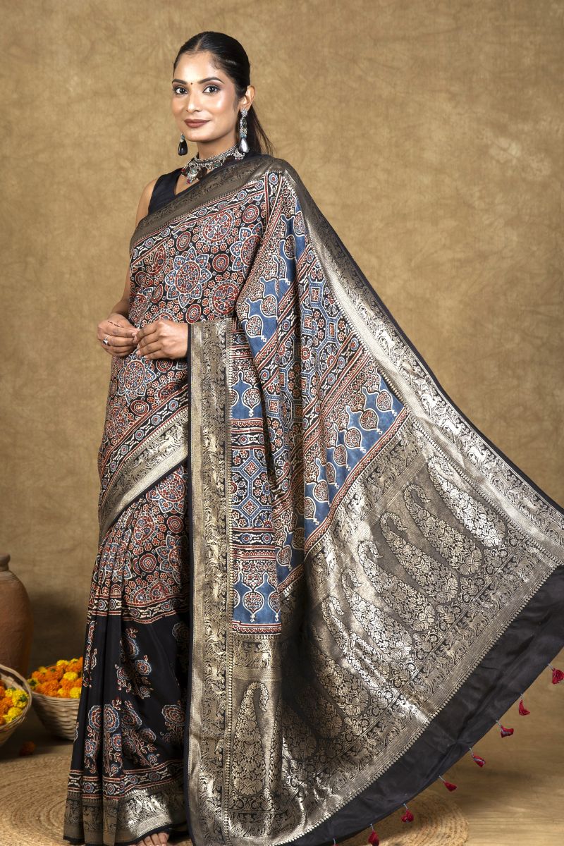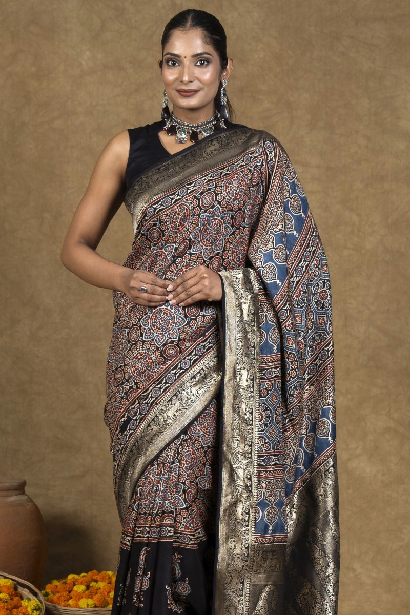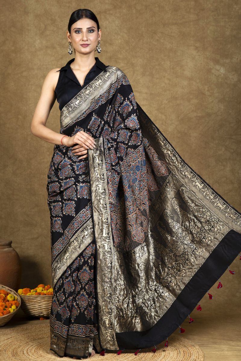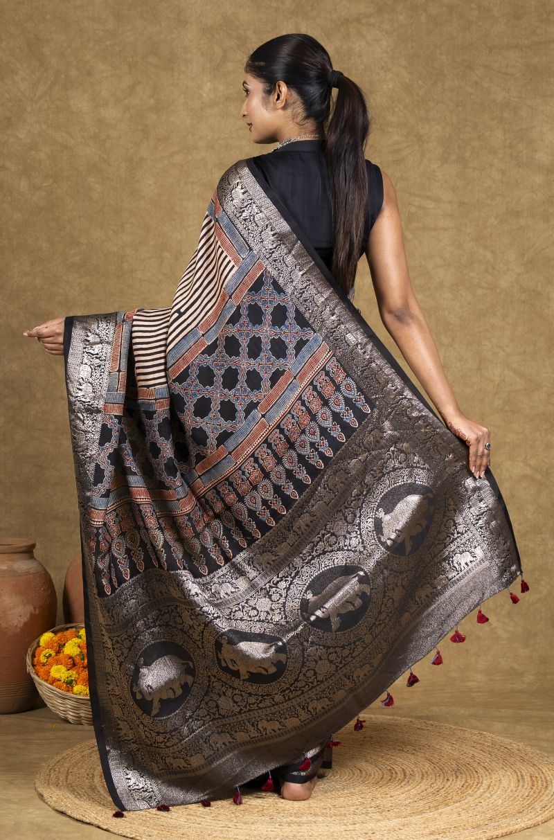 Black Flora Ajrakh Dola Silk Saree