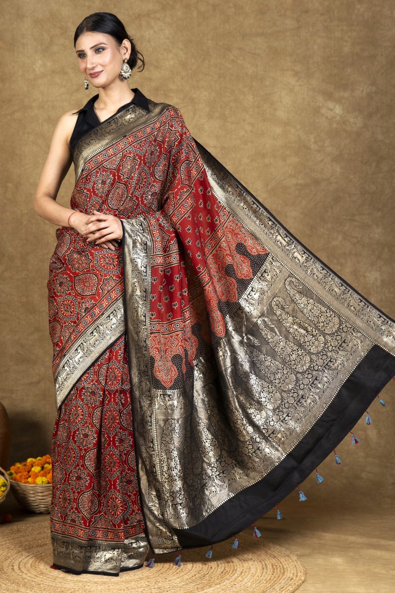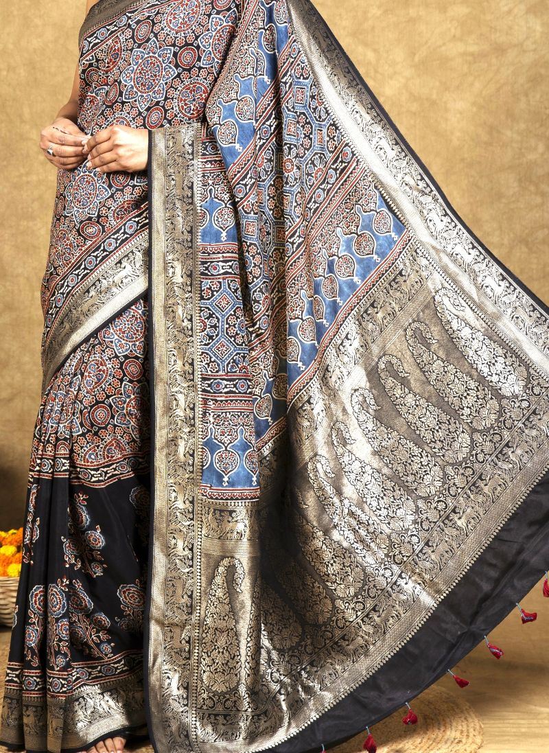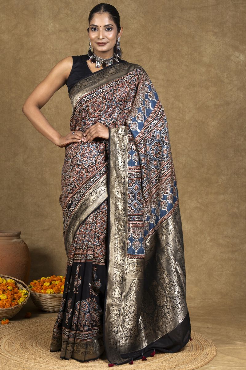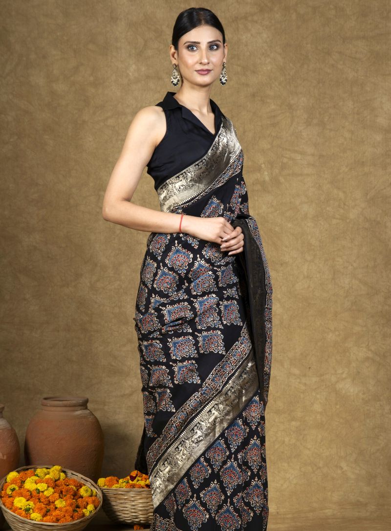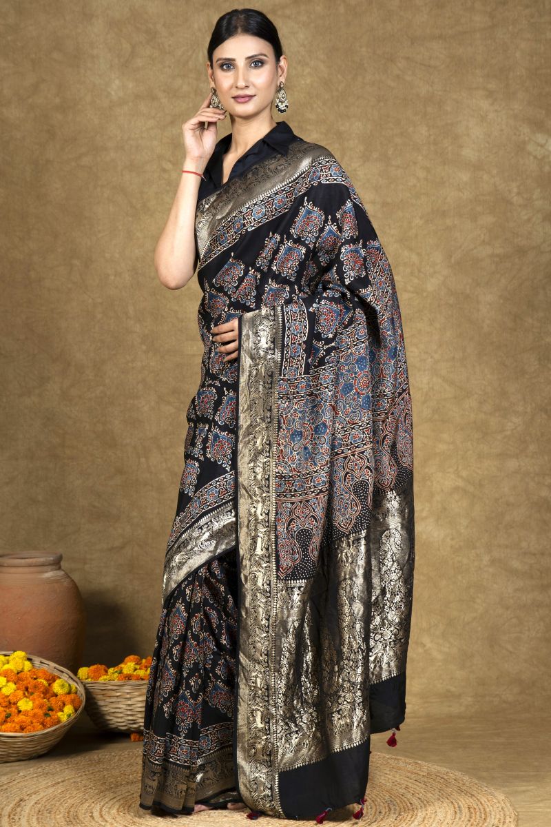 Black Flora Ajrakh Dola Silk Saree