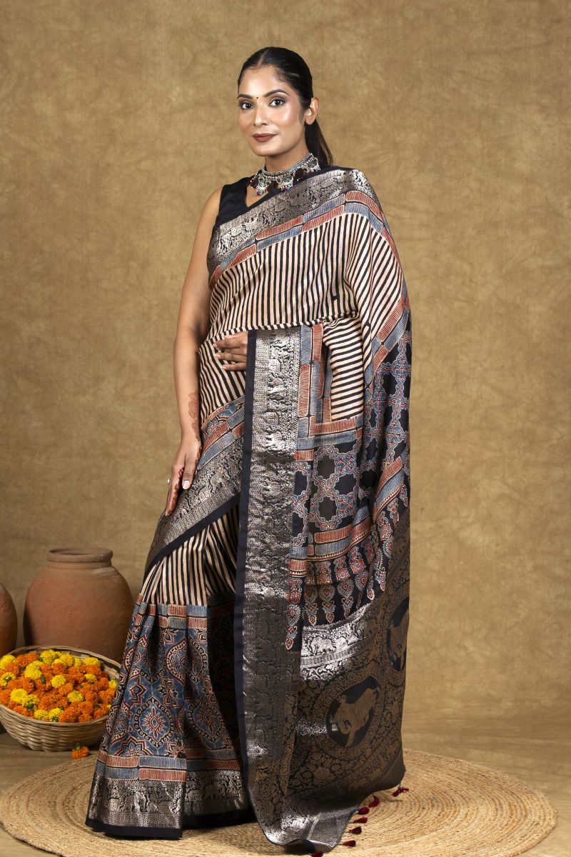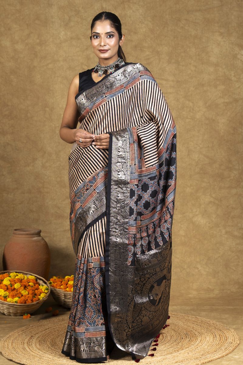 Black Beetel Ajrakh Dola Silk Saree