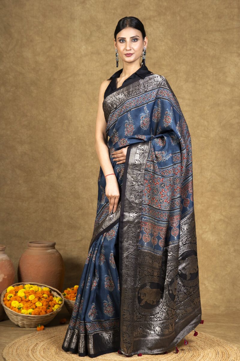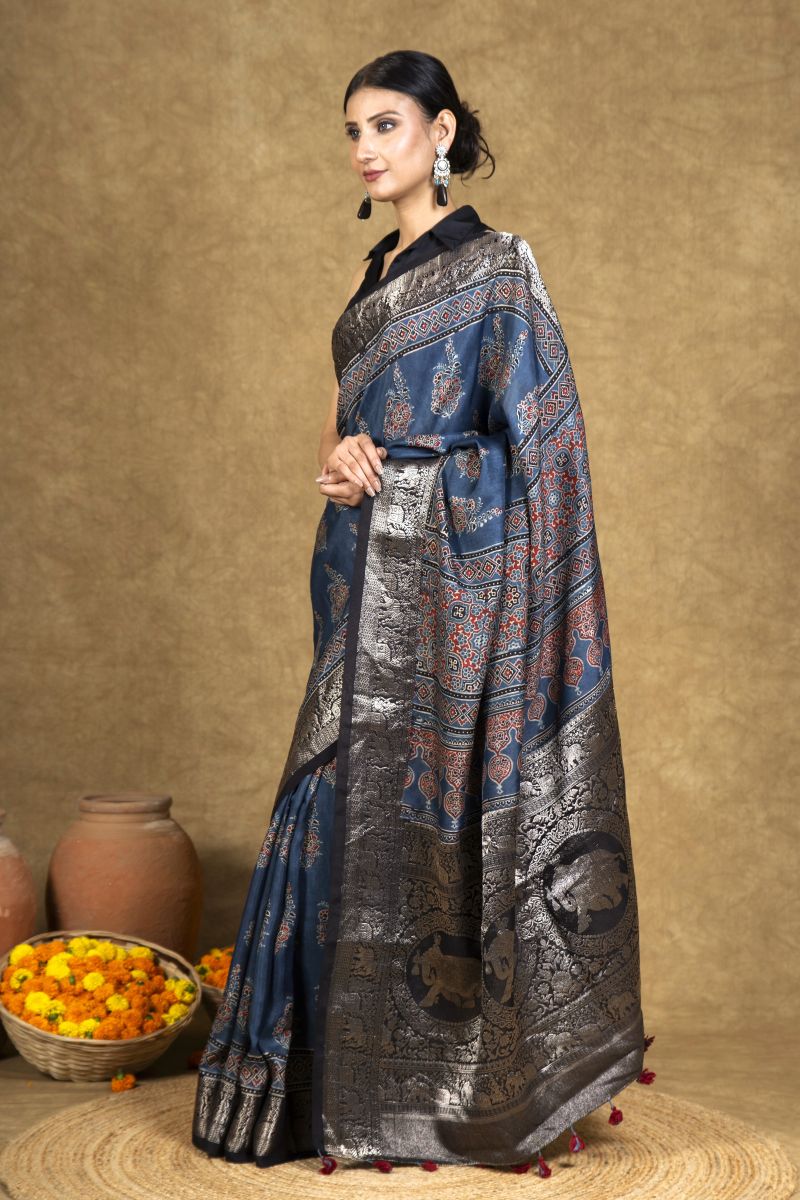 Blue Gulzar Dola Silk Ajrakh Saree
