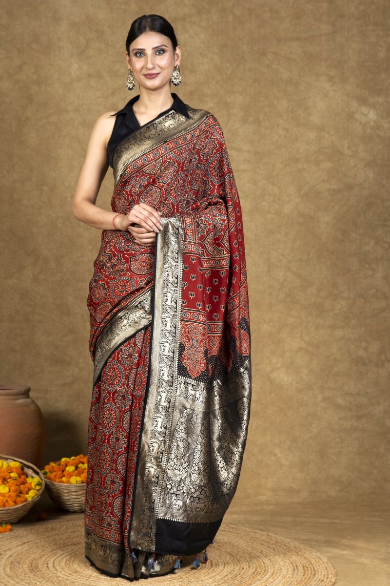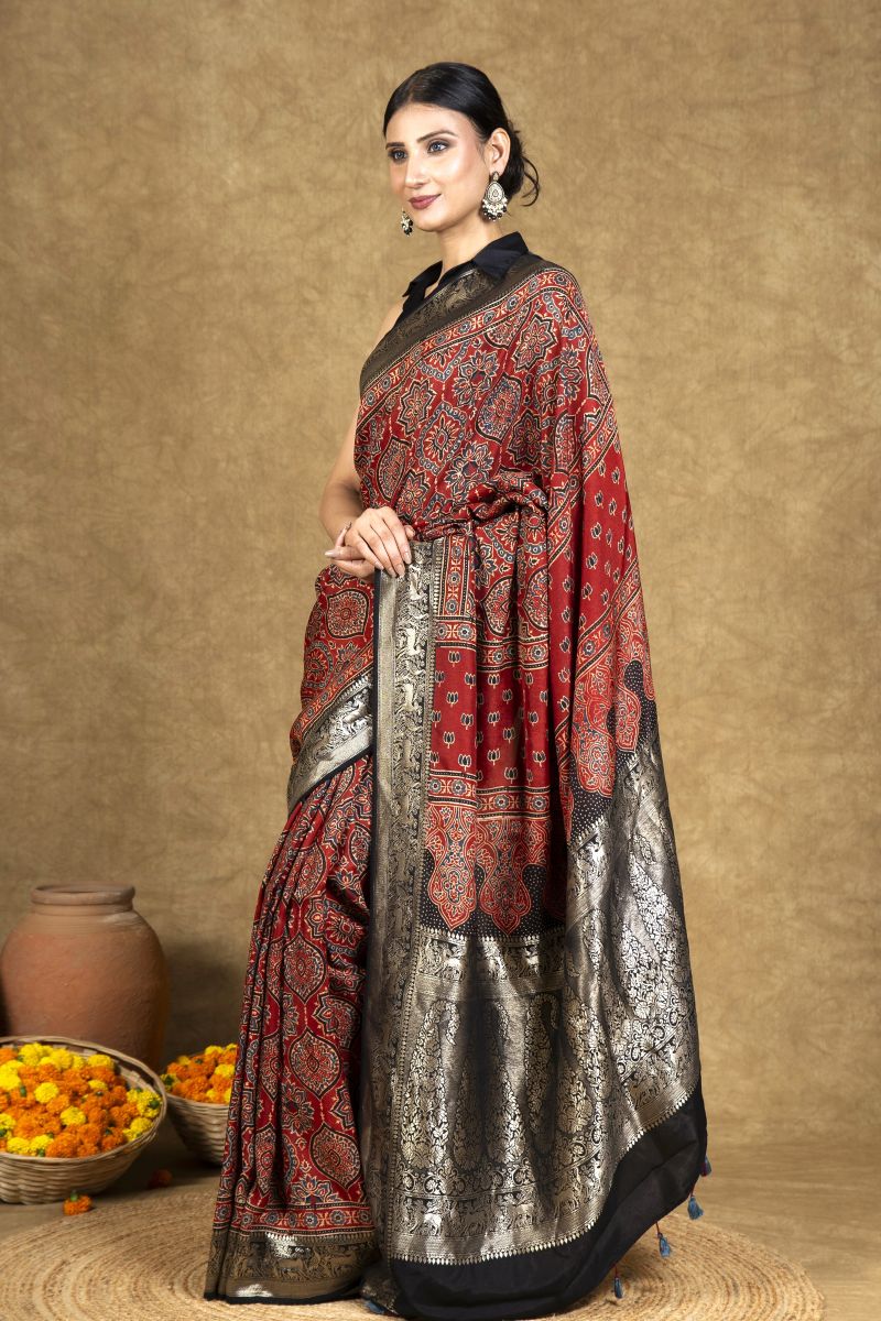 Crimson Leafy Jaal Ajrakh Dola Silk Saree