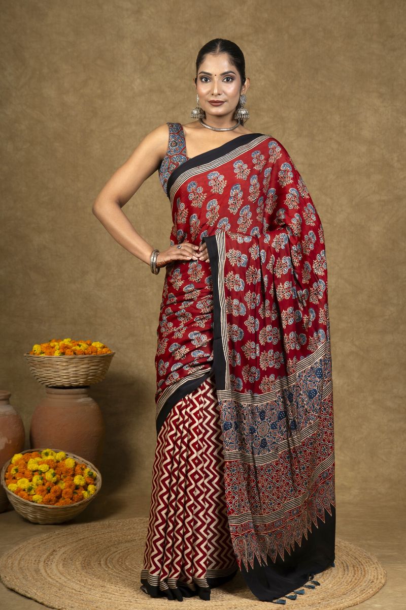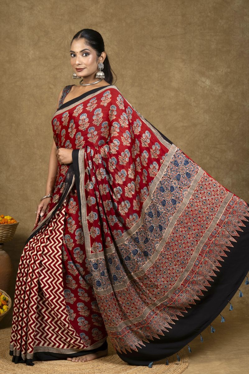 Red Chevron Flora Ajrakh Modal Silk Saree