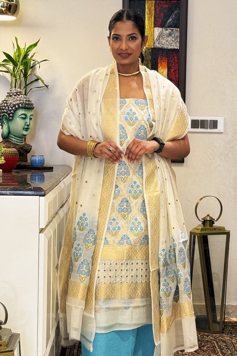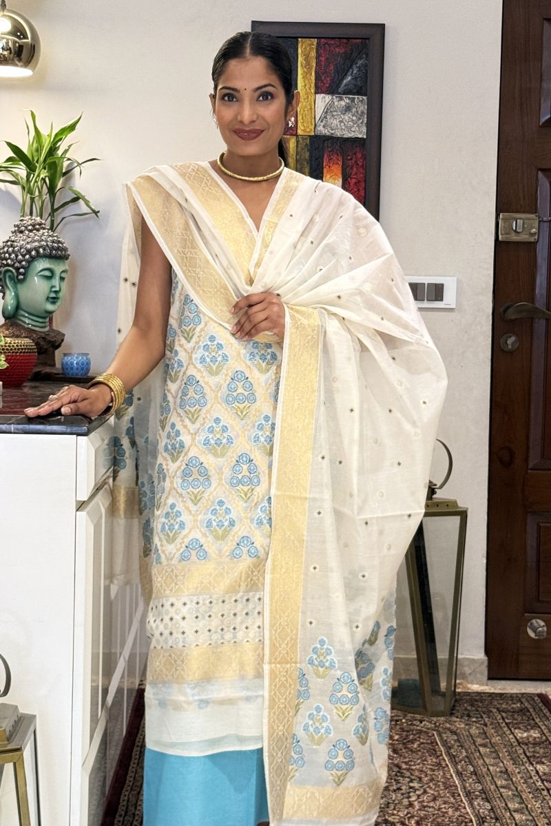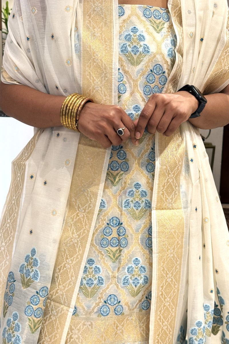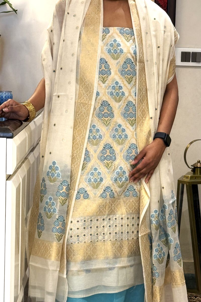 Golden Blue on Ivory Unstitched Cotton Silk Banarasi Suit (3 Pcs)