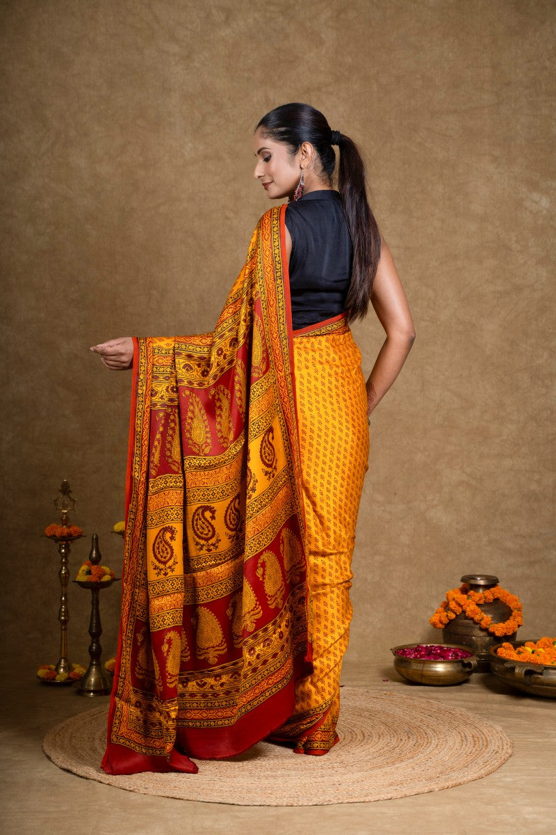 Minkundi Marigold Ajrakh Dola Silk Saree