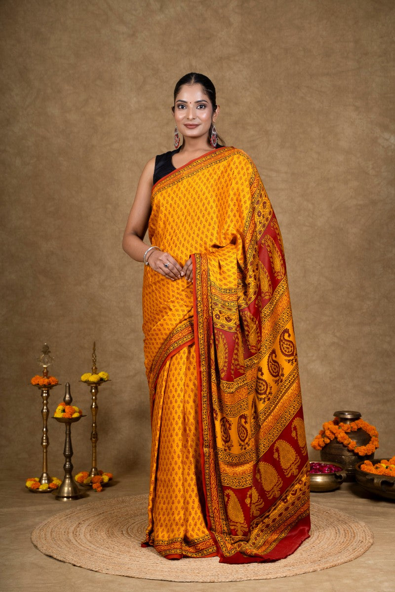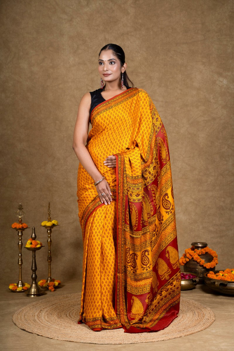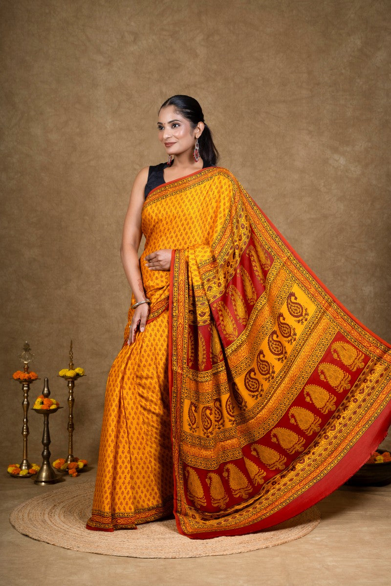 Yellow Buti Bagh Hand Block Printed Modal Silk Saree