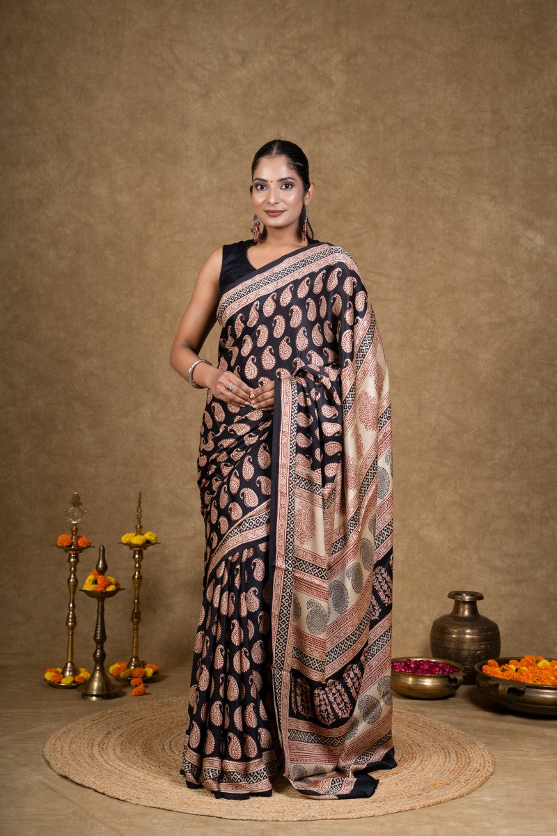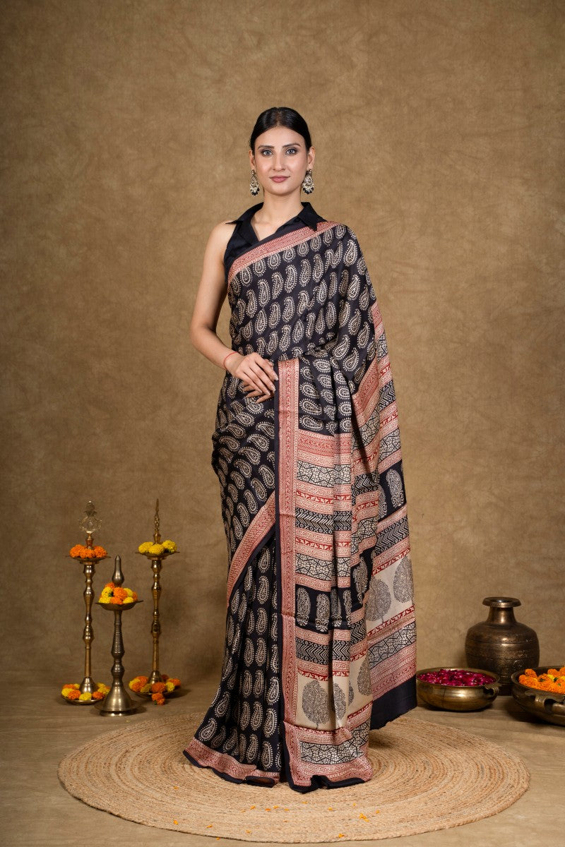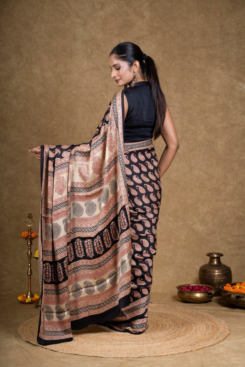 Black Paisley Bagh Hand Block Printed Modal Silk Saree