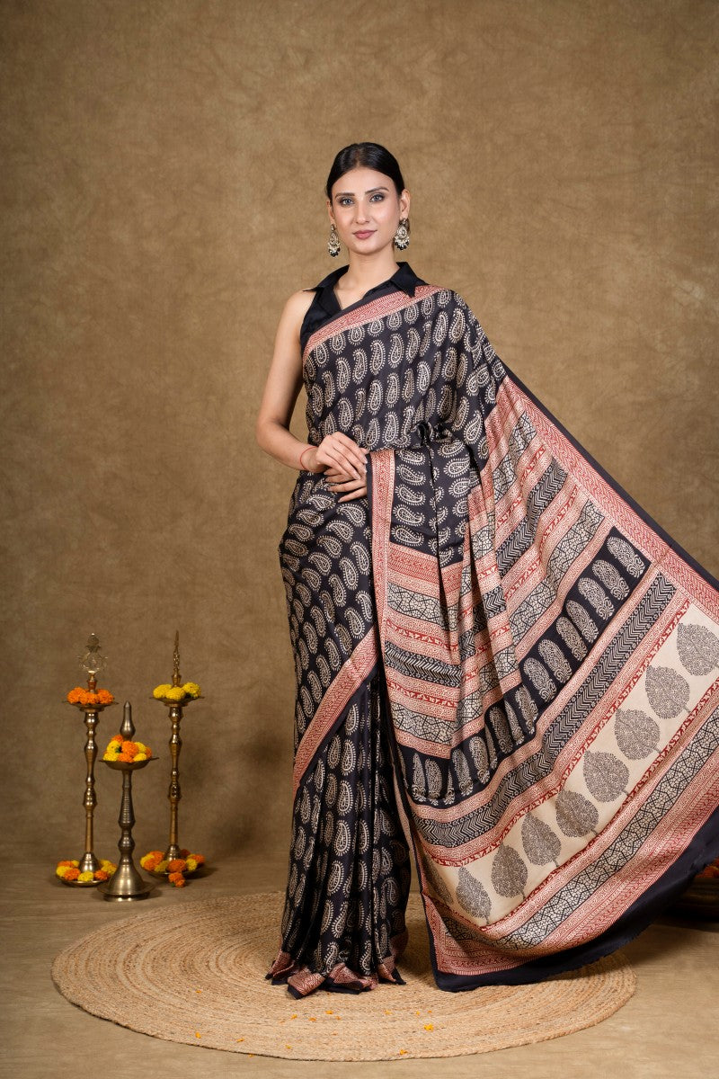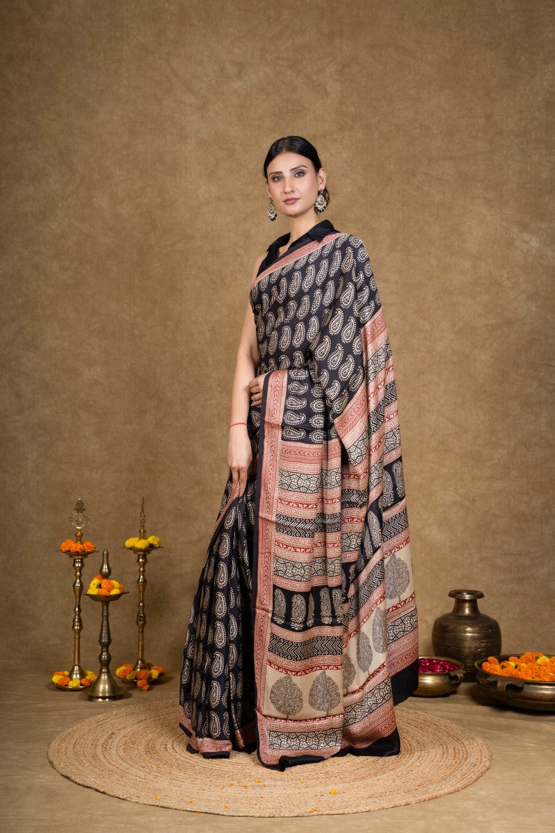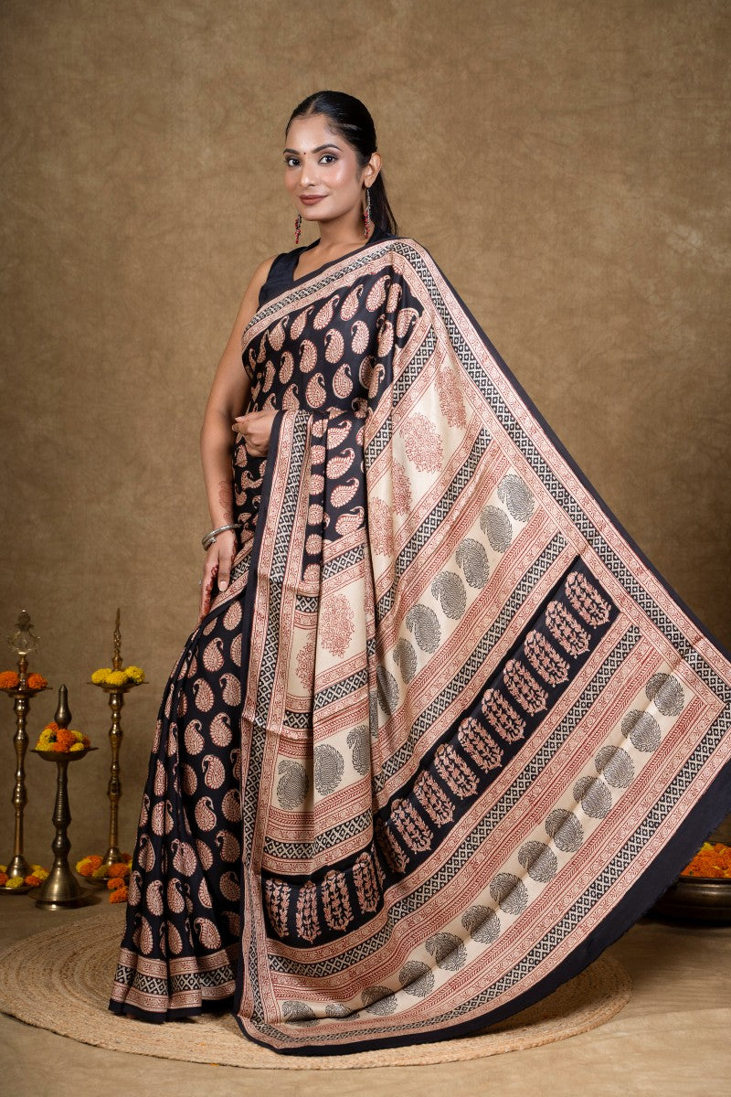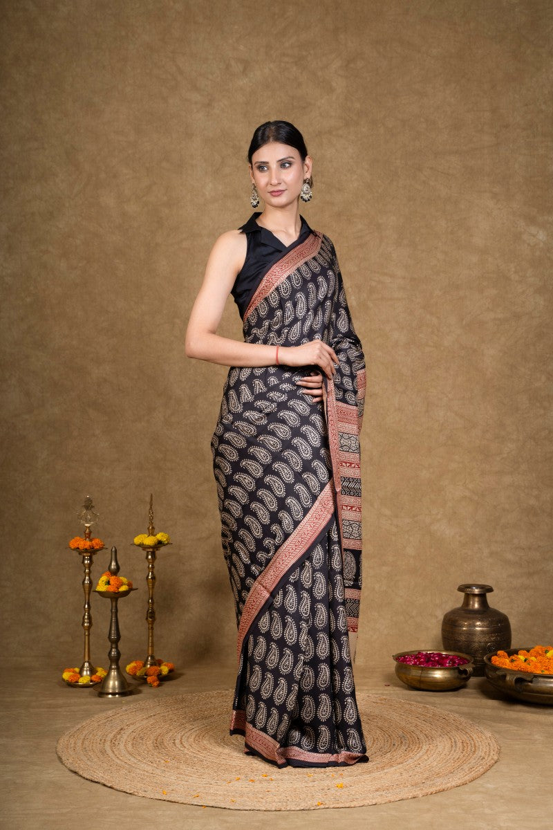 Black Paisley Bagh Hand Block Printed Modal Silk Saree