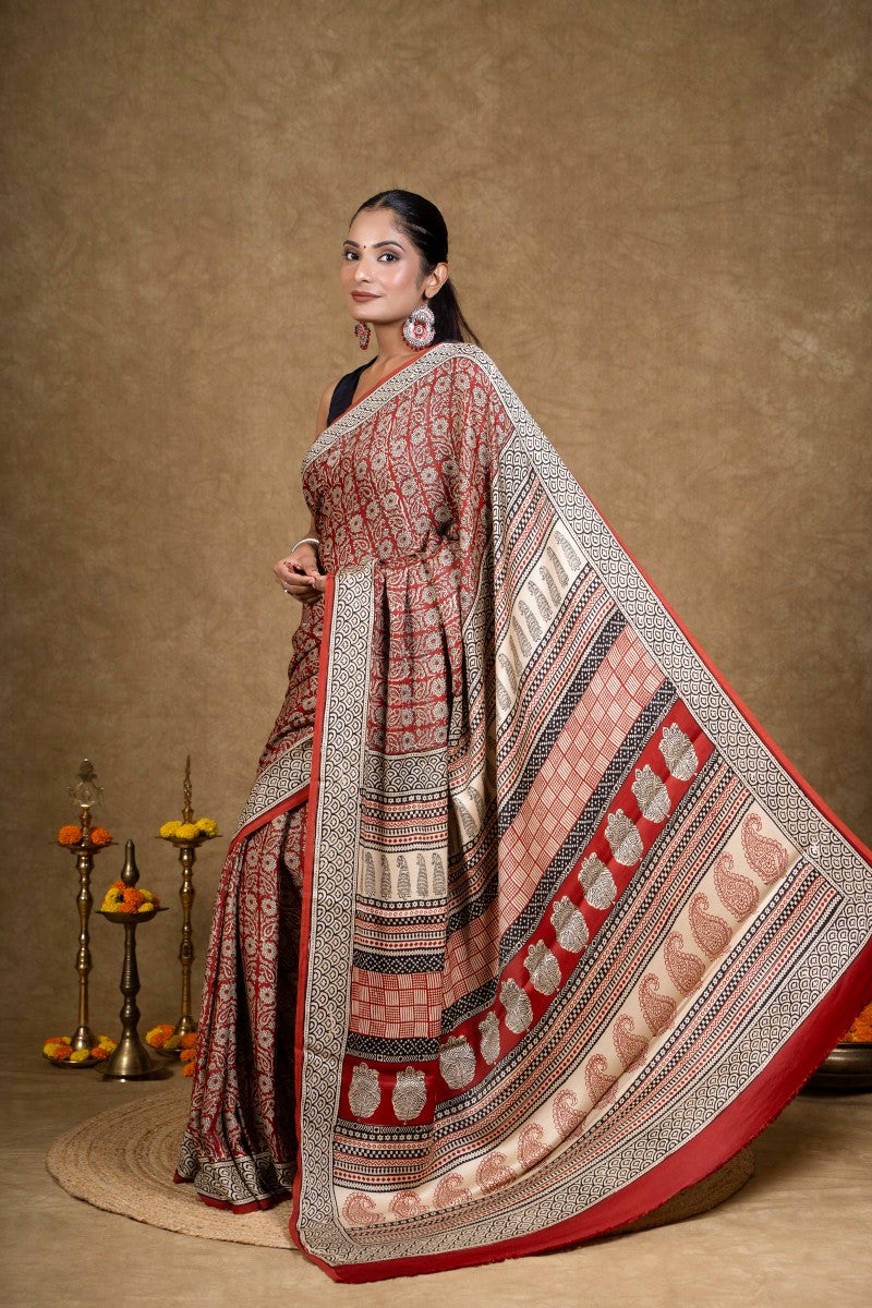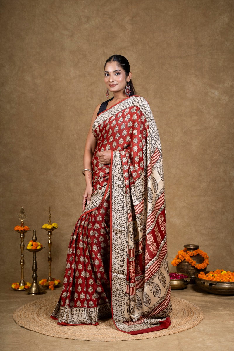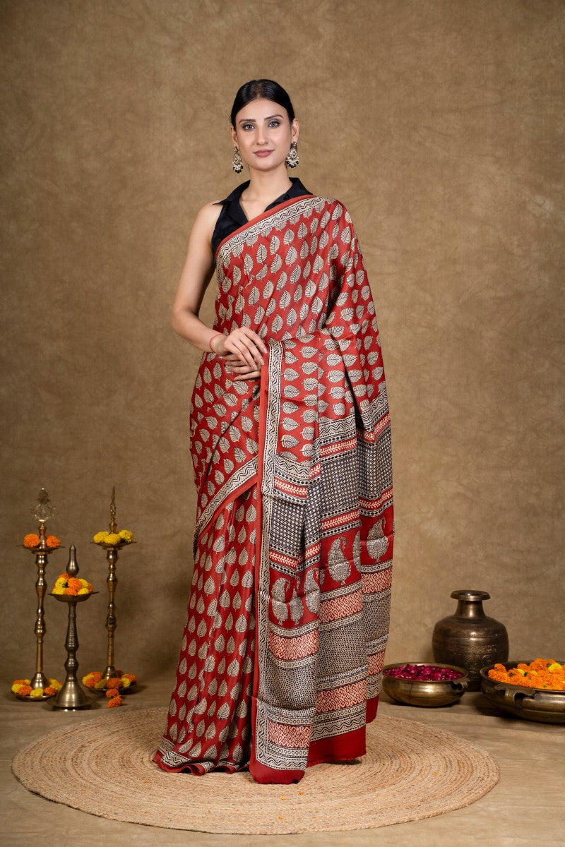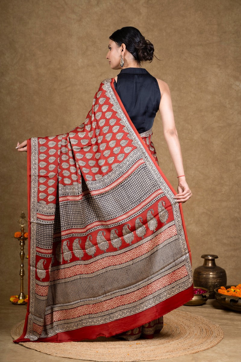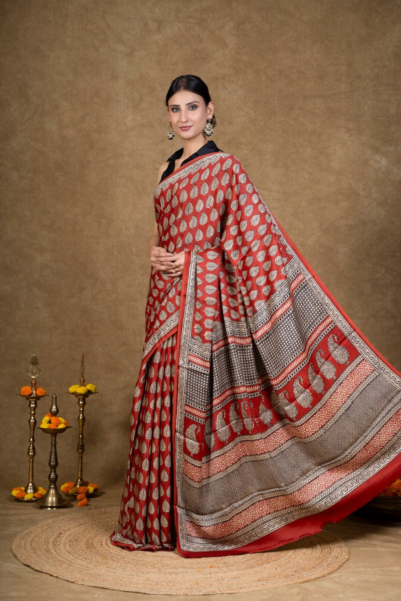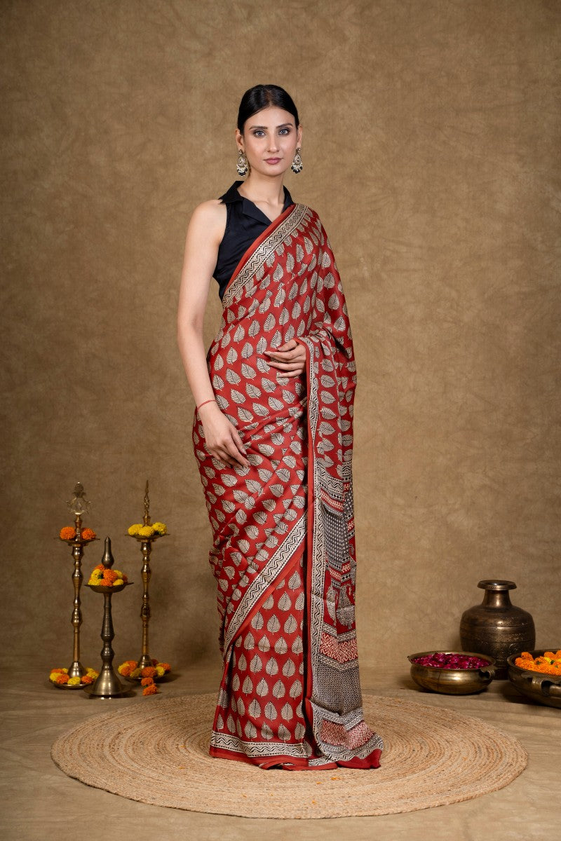 Red Leaf Bagh Hand Block Printed Modal Silk Saree