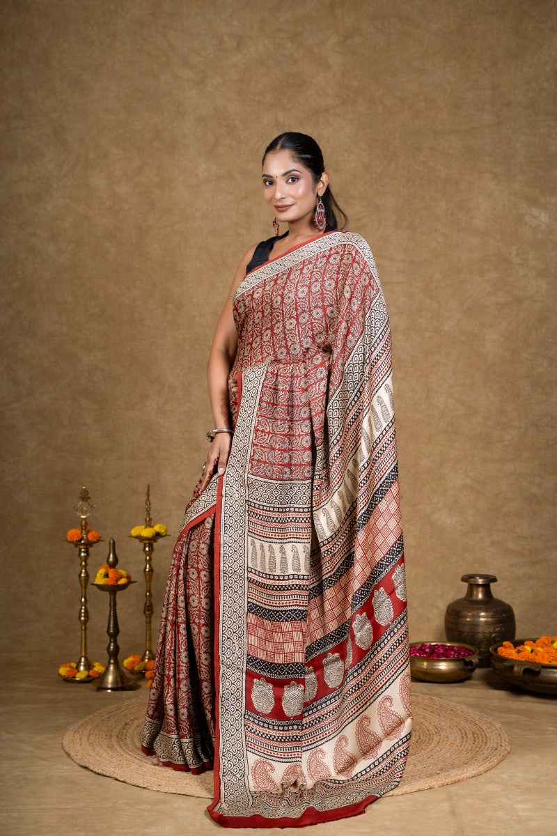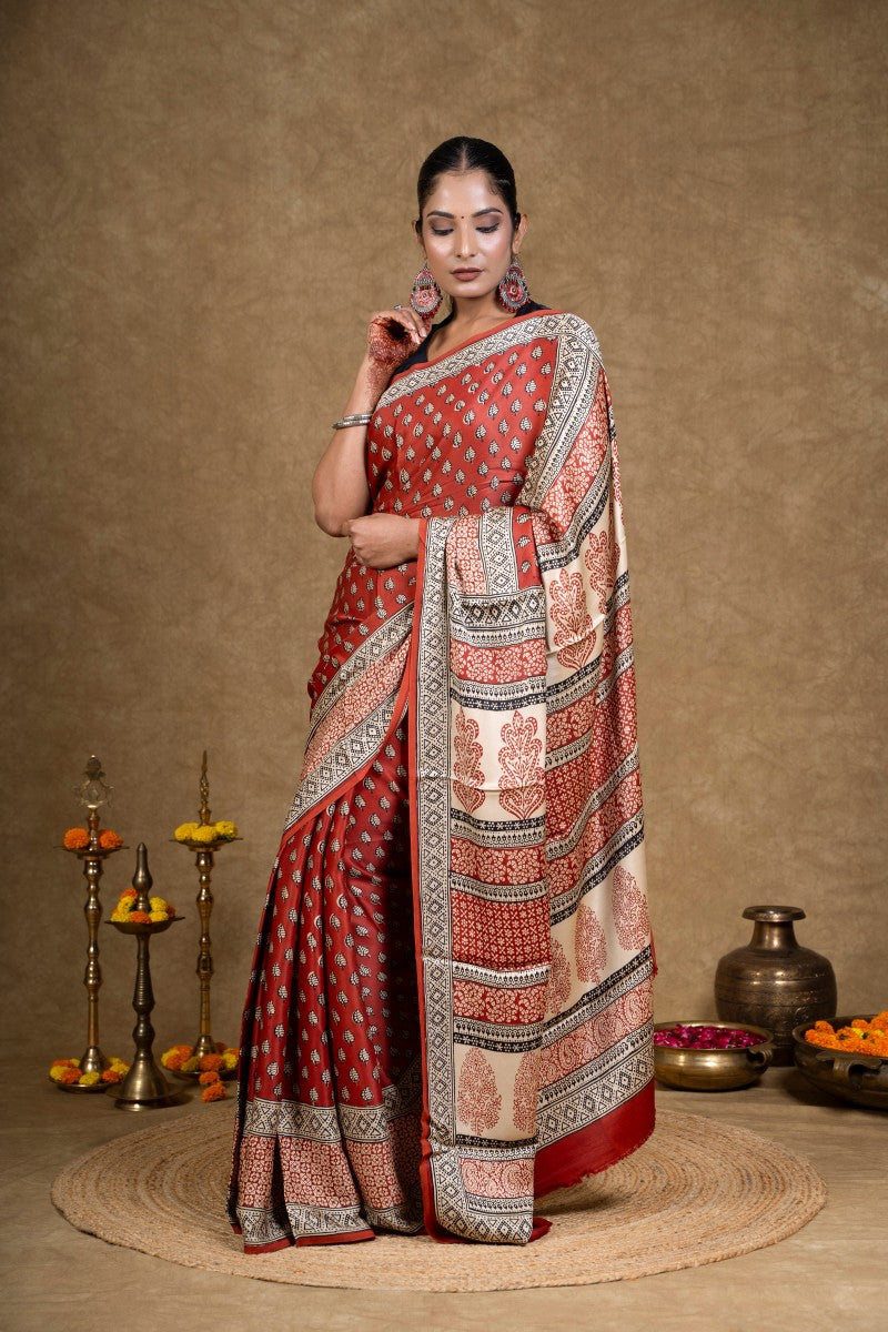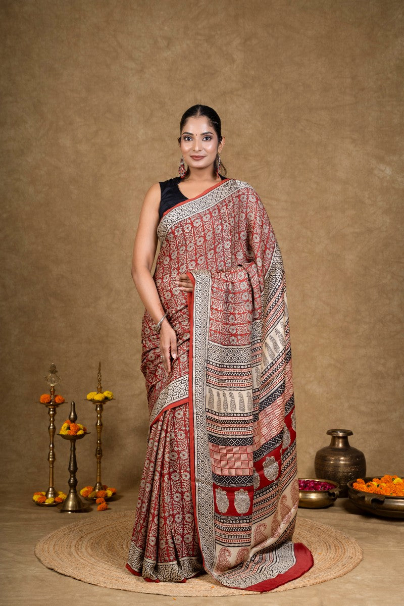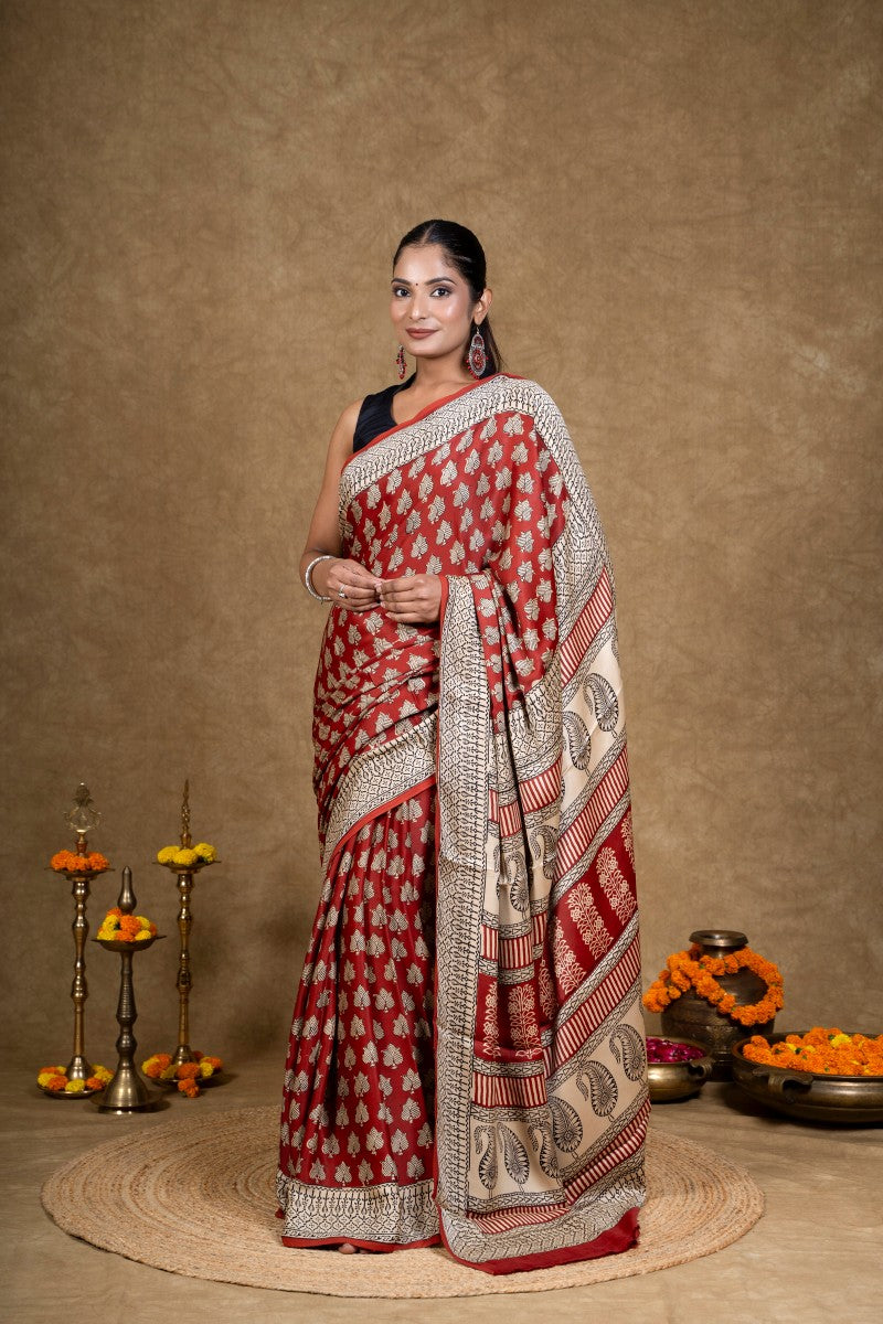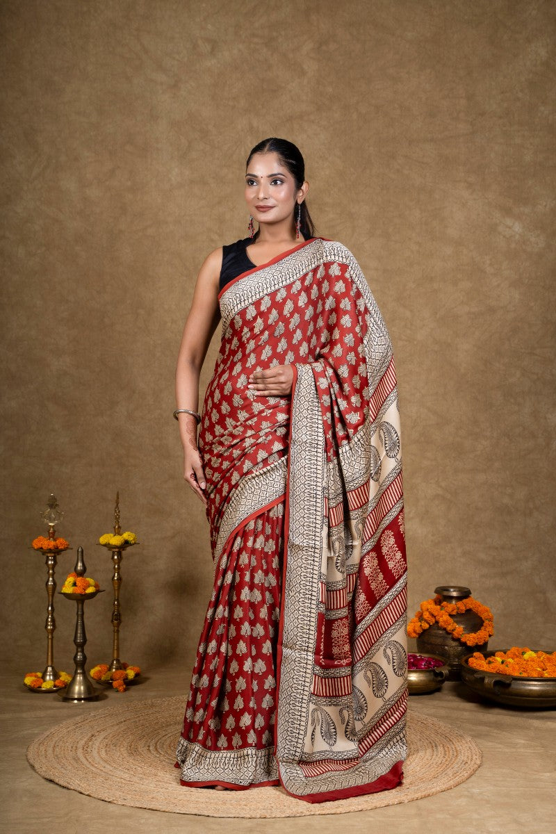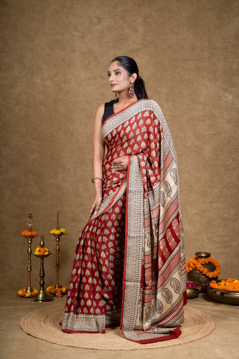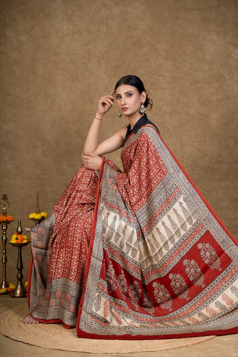 Red Leaf Bagh Hand Block Printed Modal Silk Saree