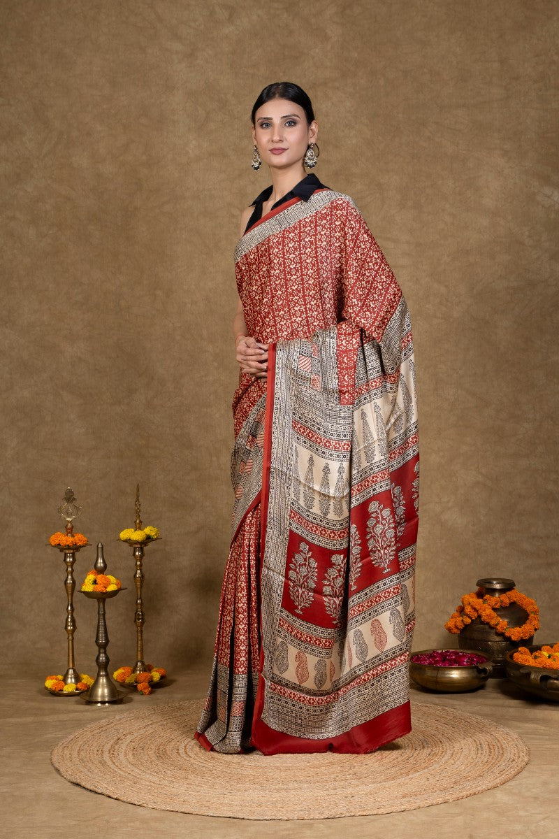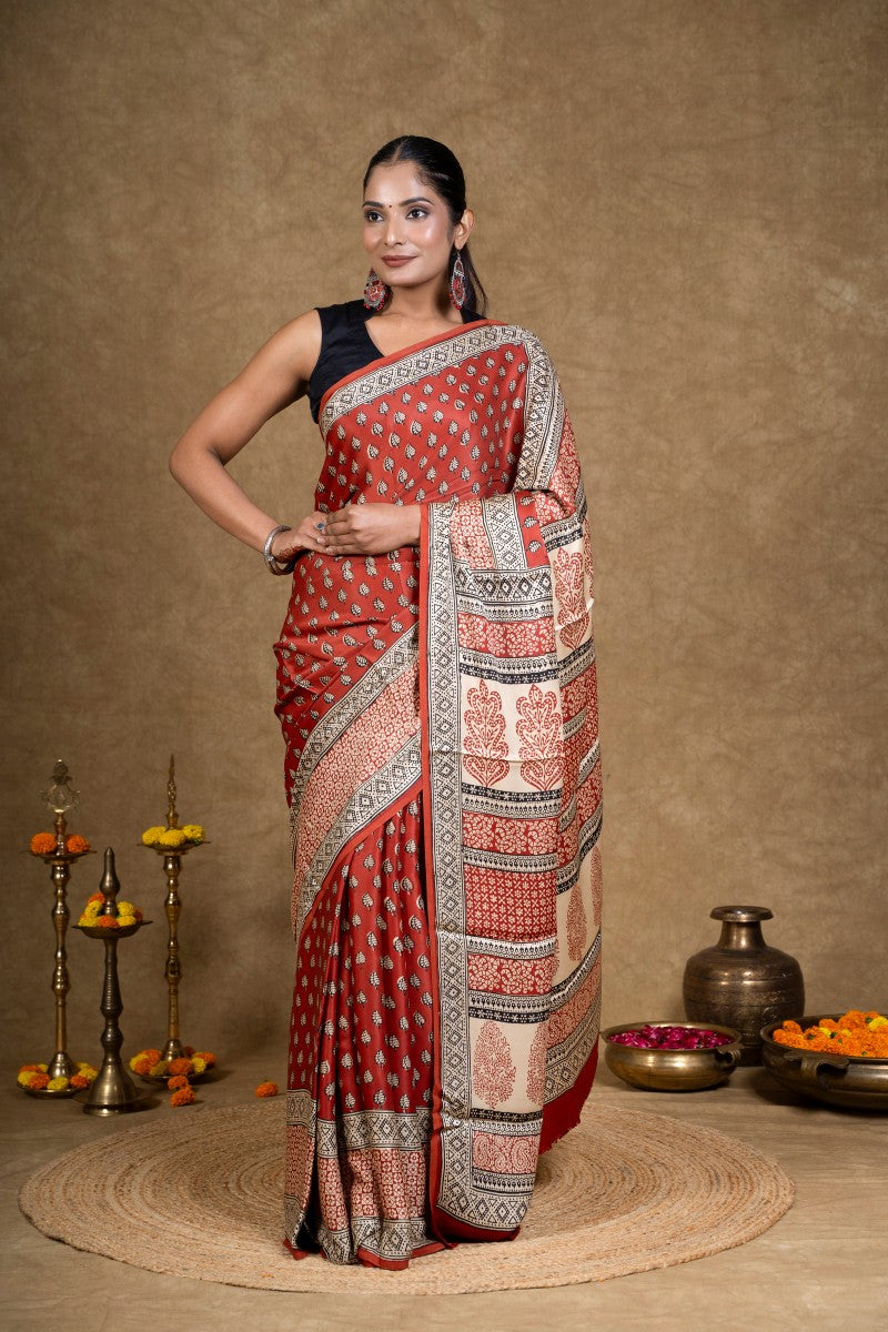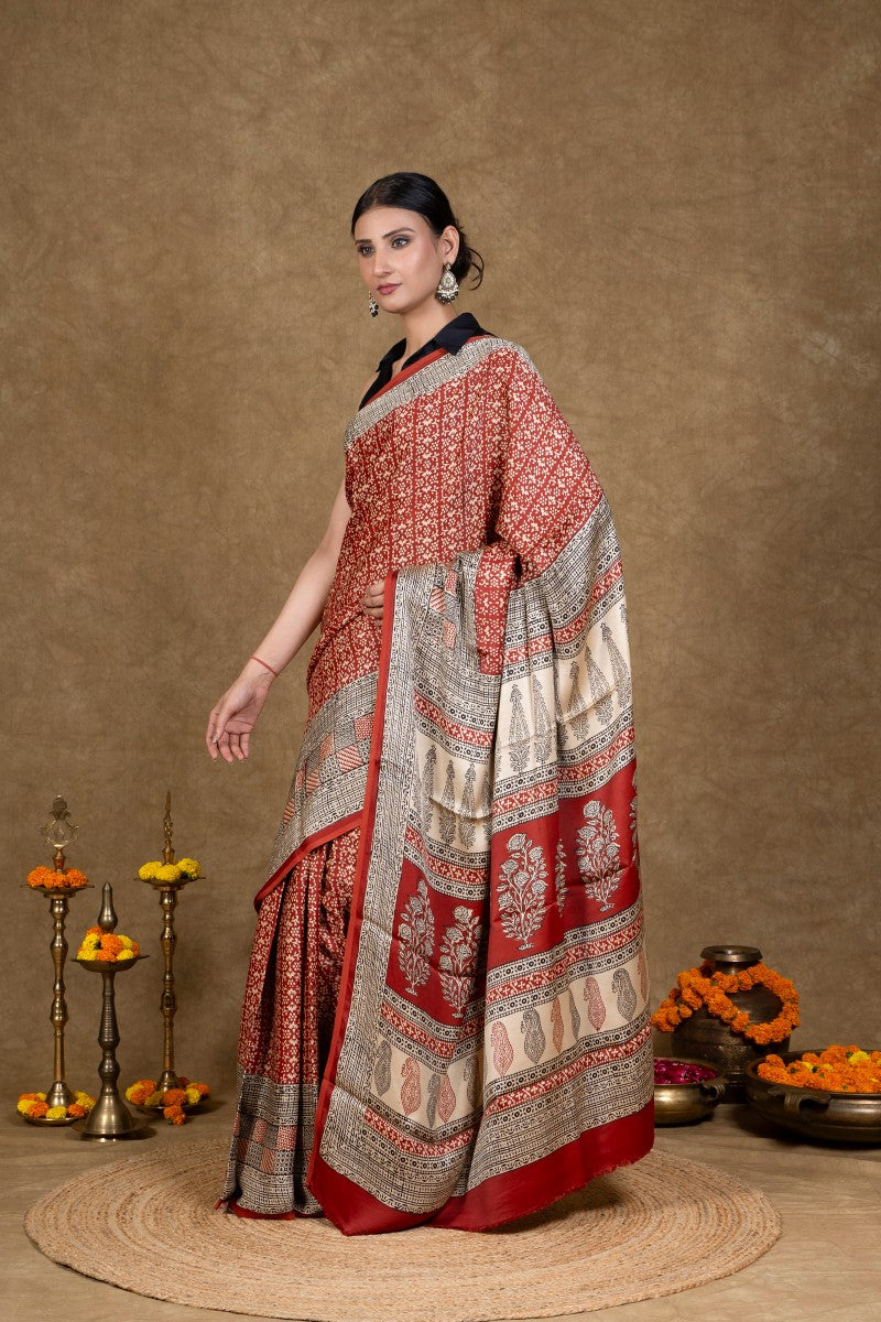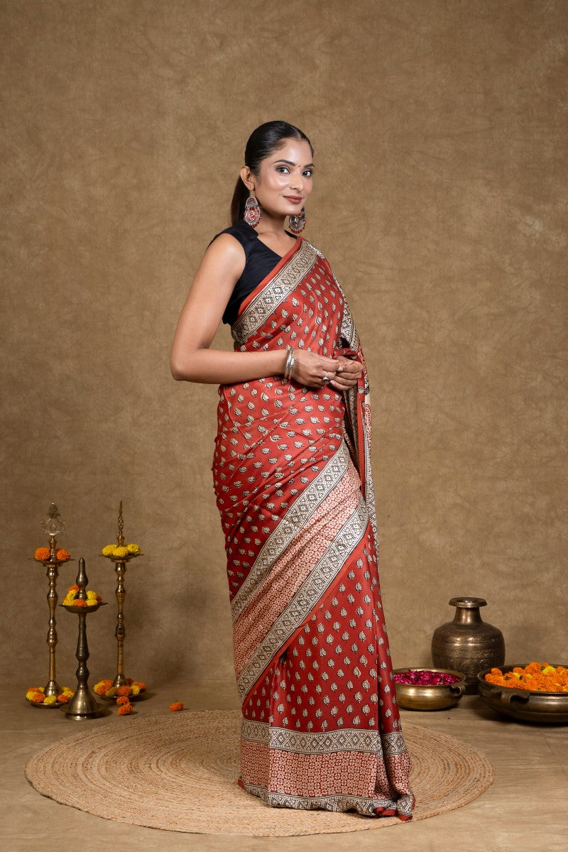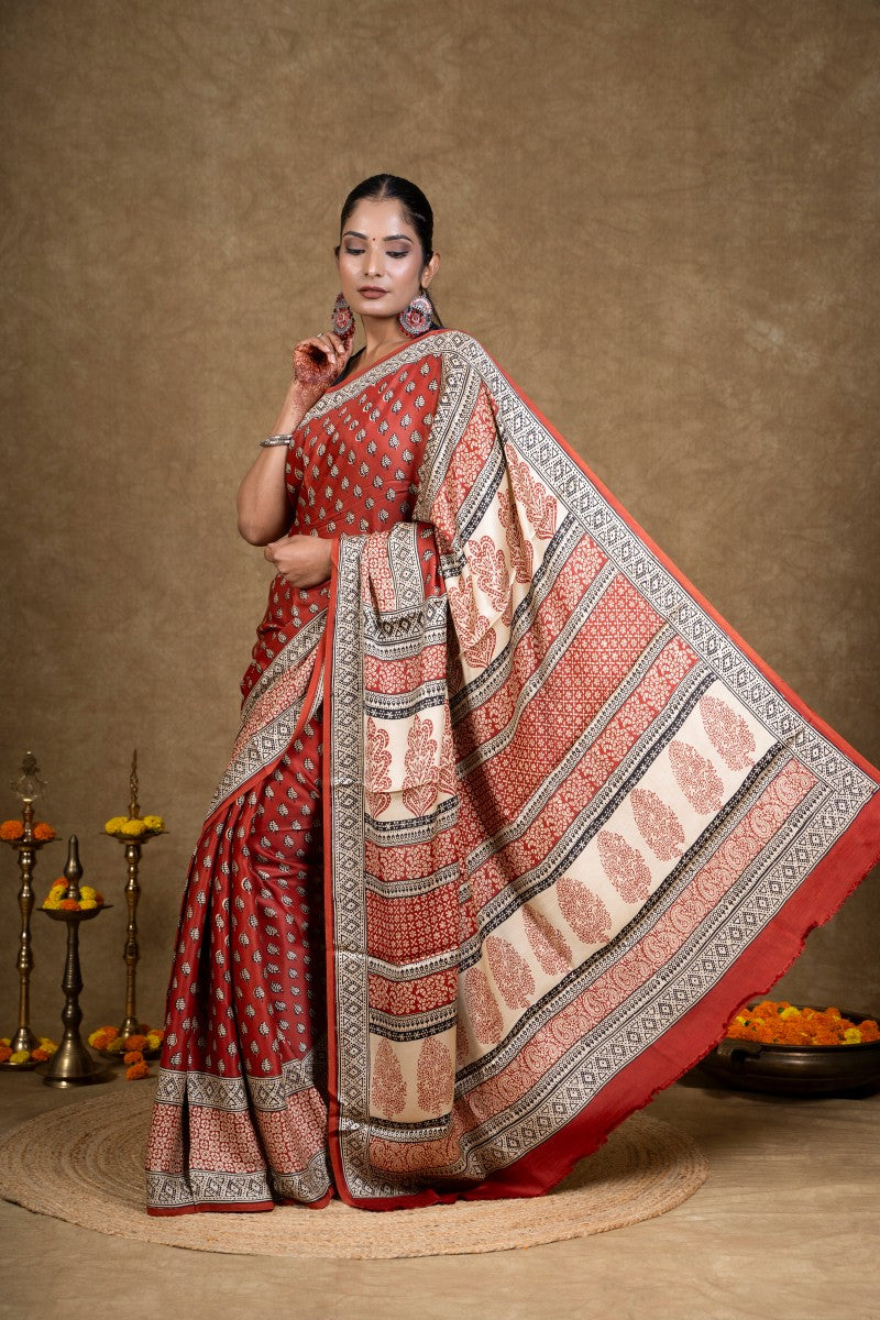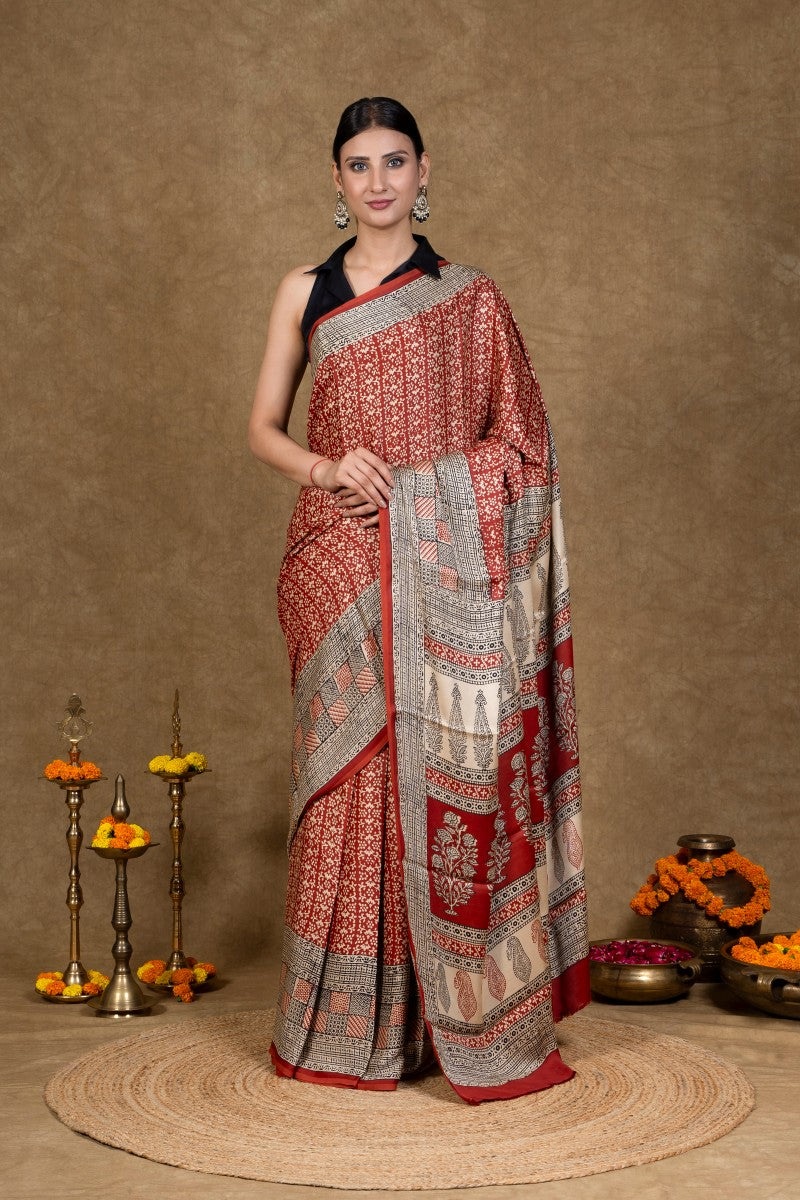 Red Leaf Bagh Hand Block Printed Modal Silk Saree