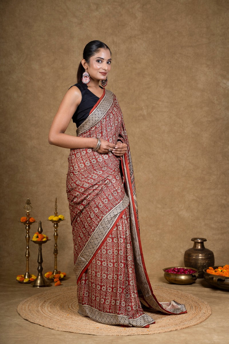 Red Flora Bagh Hand Block Printed Modal Silk Saree