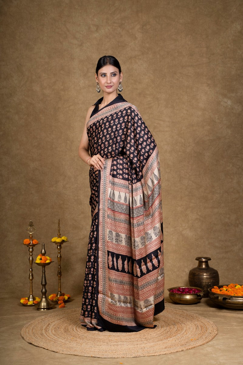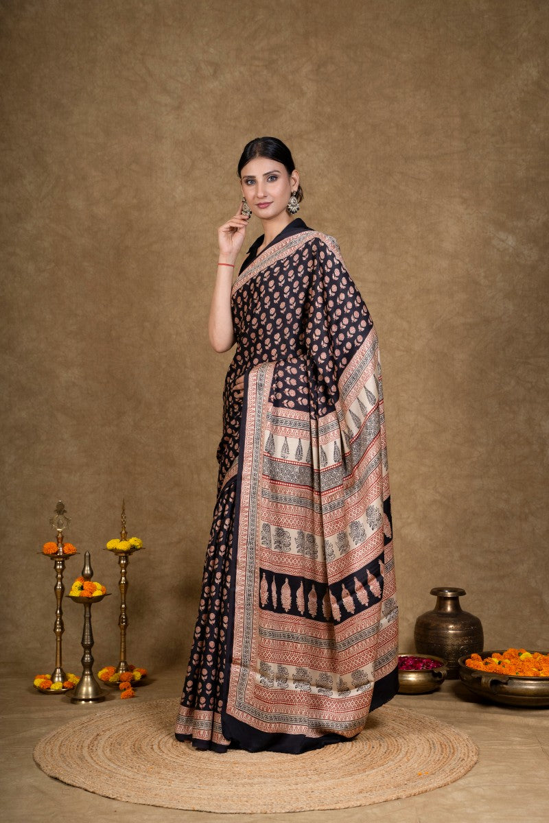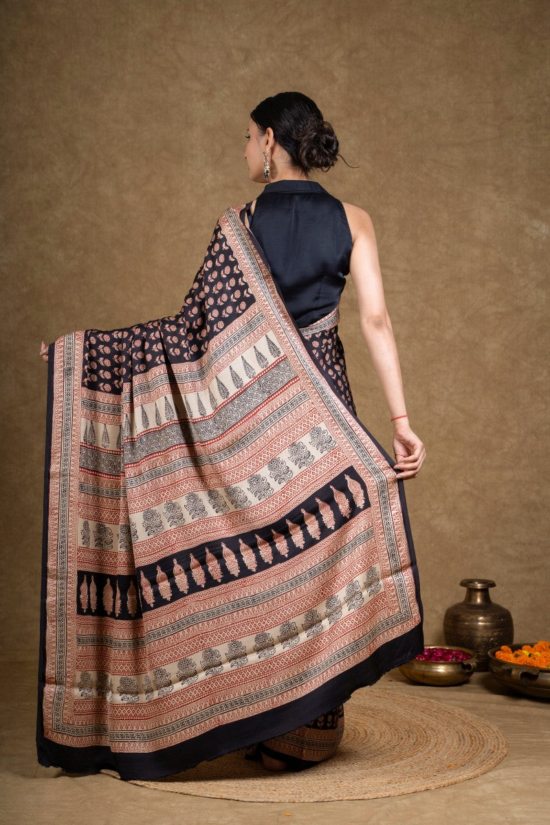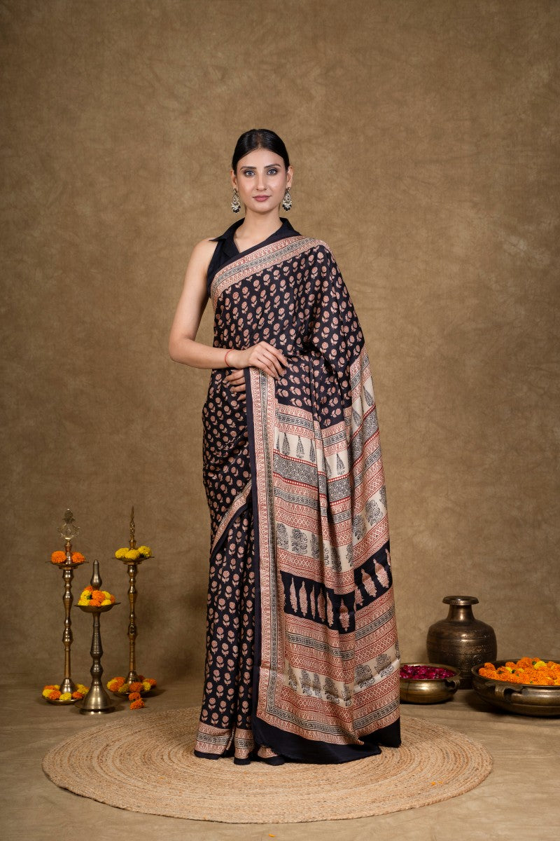 Black Flora Bagh Hand Block Printed Modal Silk Saree