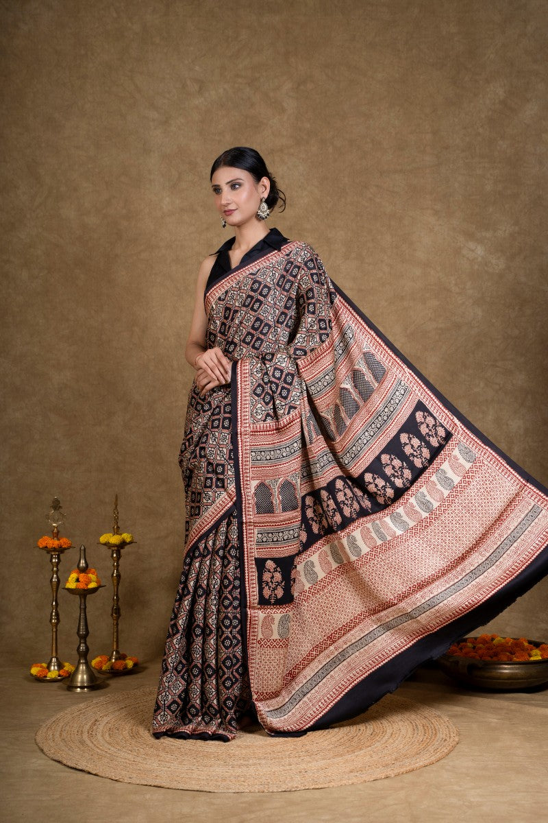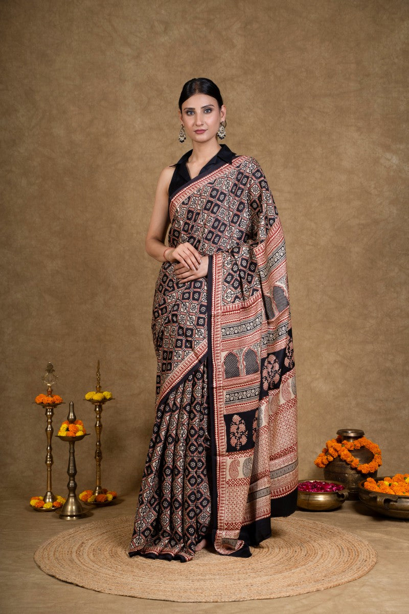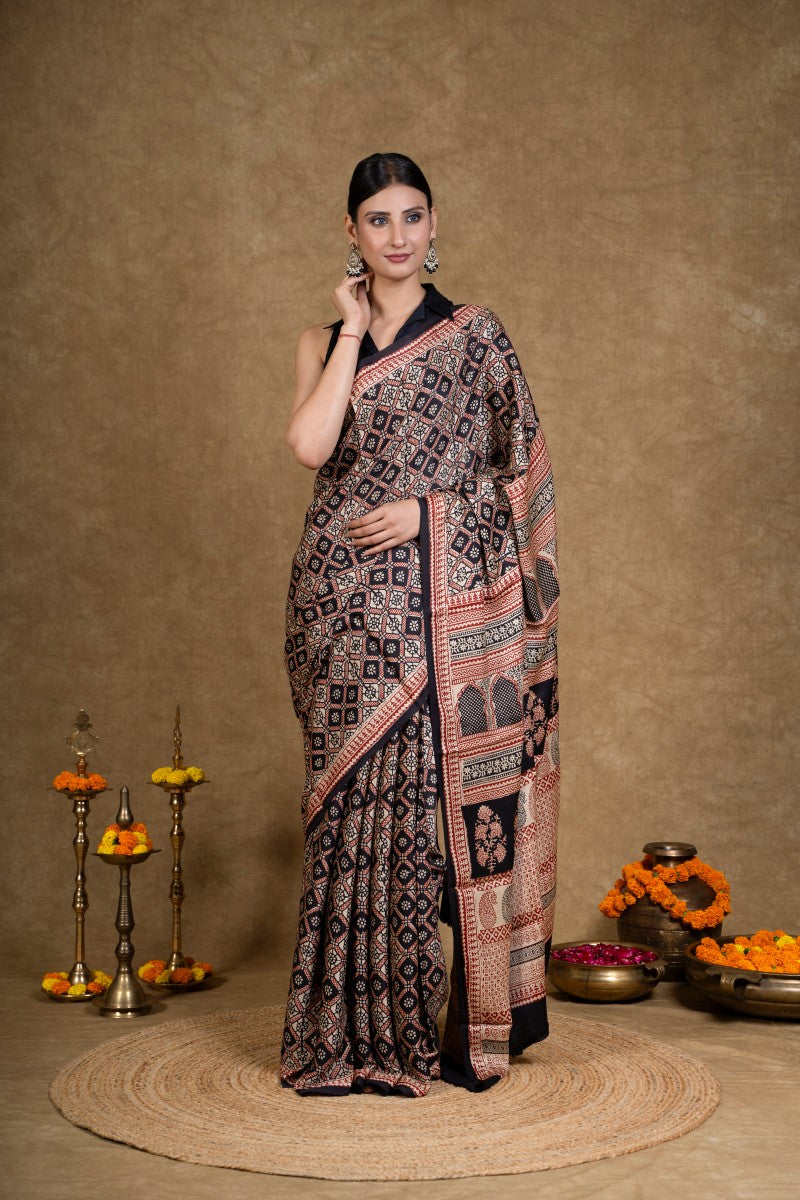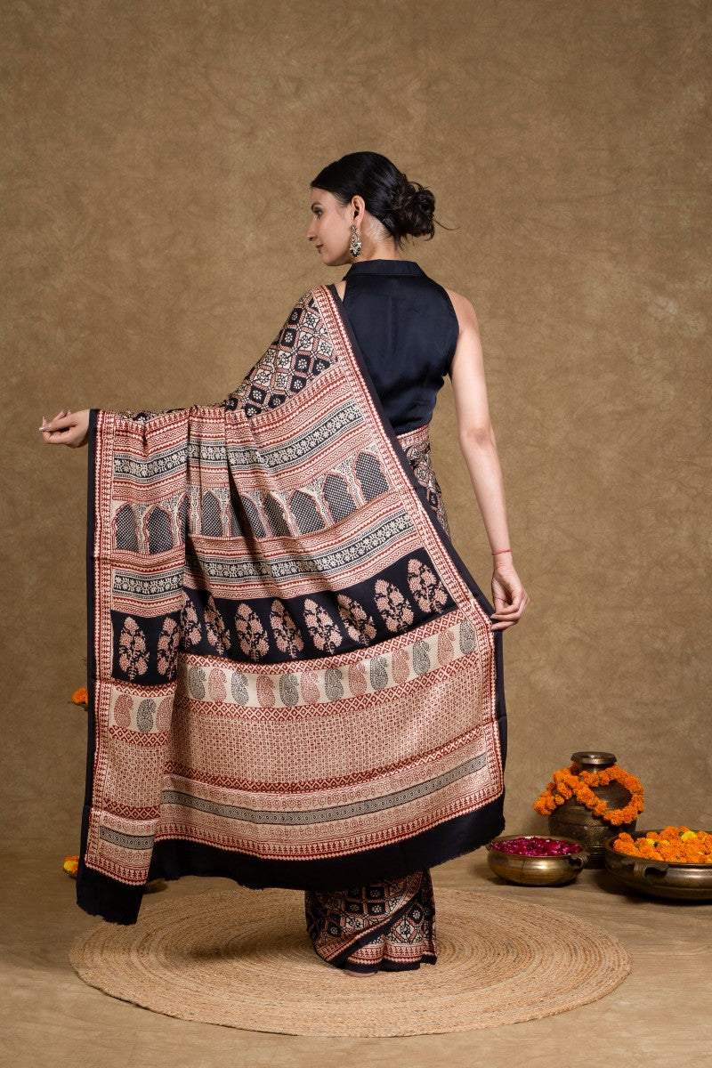 Black Flora Bagh Hand Block Printed Modal Silk Saree