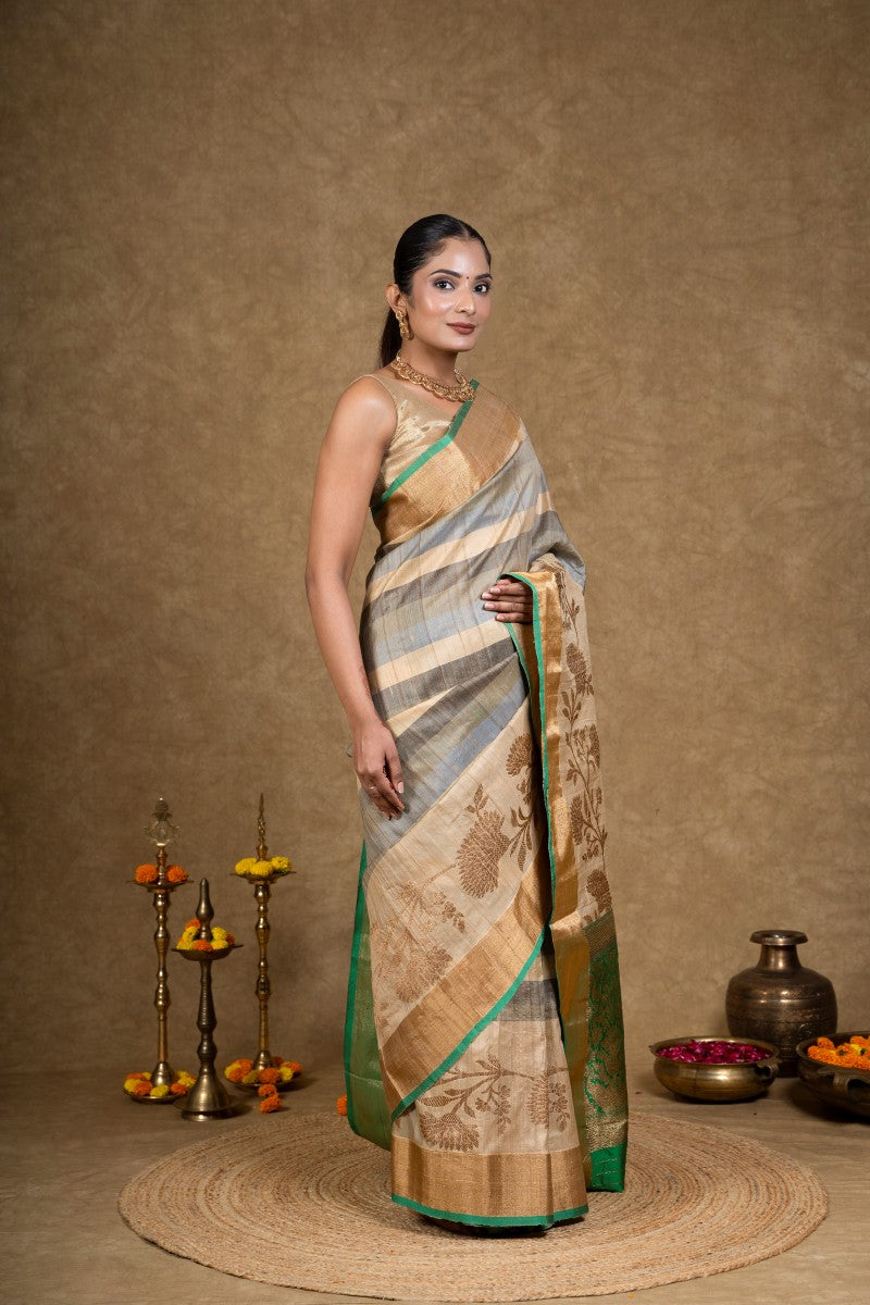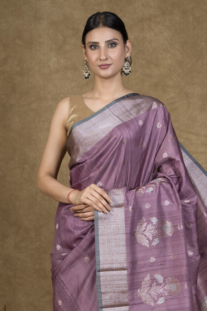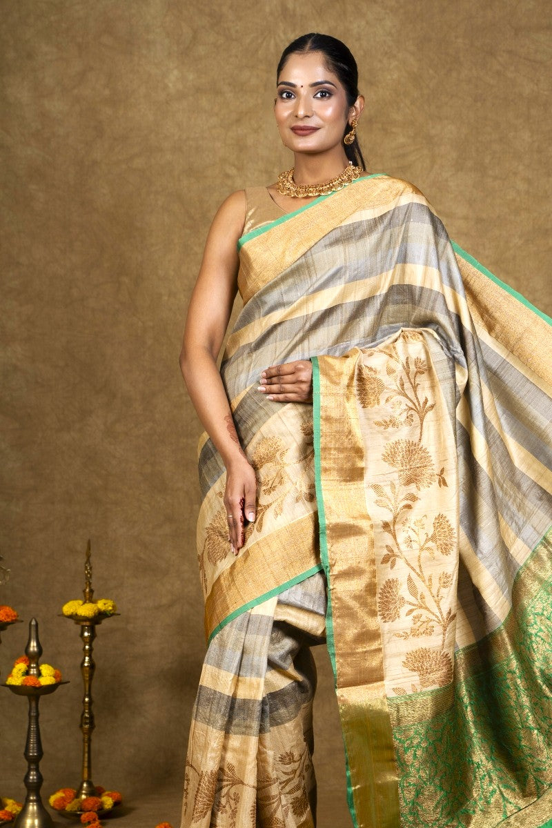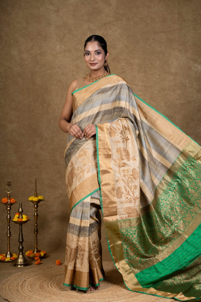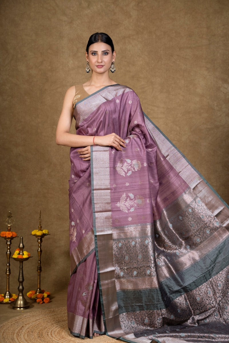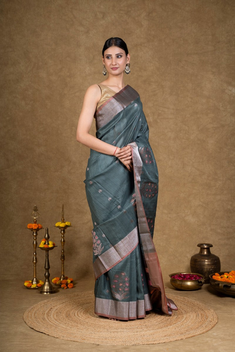 Raspberry Teal Zari Tussar Silk Banarasi Saree